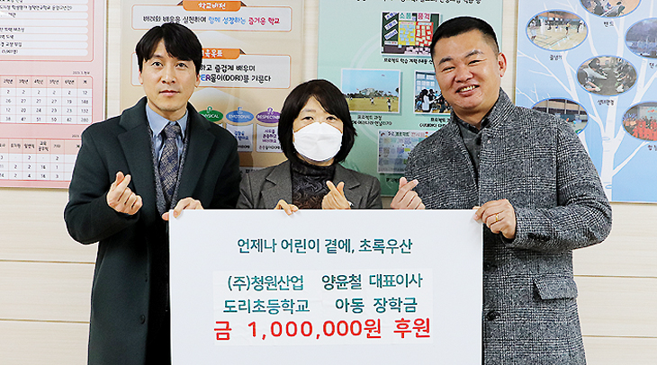 (주)청원산업 양윤철 대표이사는 최근 도리초등학교(교장 이은경) 졸업을 축하하며 아동장학금 100만원을 초록우산 제주지역본부(본부장 변정근)에 전달했다.