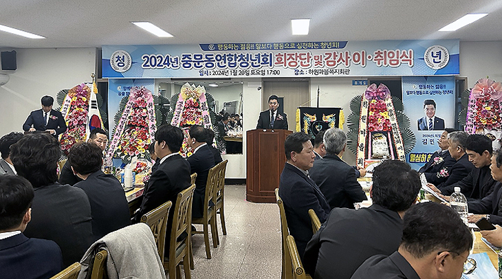 서귀포시 중문동연합청년회(신임회장 김민규)는 지난 20일 하원마을복지회관에서 역대 회장단 및 자생단체장 등이 참석한 가운데 회장단 및 감사 이·취임식을 개최했다.