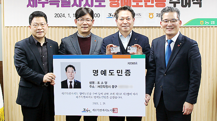 제주특별자치도는 지난 19일 농협중앙회 제주본부에서 문경삼 농축산식품국장, 윤재춘 제주농협 본부장 등이 참석한 가운데 조소행 농협중앙회 상호금융대표이사에게 명예도민증을 수여했다.