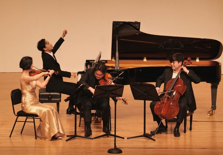 지난해 열린 제6회 제주국제실내악페스티벌 개막 공연의 피날레를 장식하고 있는 서울대 백주영 교수와 연세대 김상진 교수, 영화 ‘호로비츠를 위하여’의 주인공 피아니스트 김정원과 클래식계의 아이돌 첼리스트 심준호의 무대. 제주국제실내악페스티벌조직위원회 제공