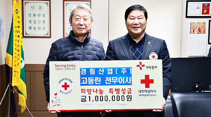고동린 경림산업 전무이사는 지난 26일 경림산업 사무실에서 대한적십자사제주도지사(회장 정태근)에 2024년 희망나눔 특별성금 100만원을 전달했다.