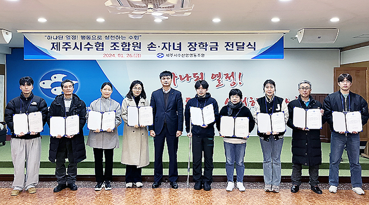 제주시수협(김경필 조합장)은 지난 26일 가정형편이 어려운 조합원 손·자녀 11명(대학생 10명, 고등학생 1명)에게 장학금을 전달했다.