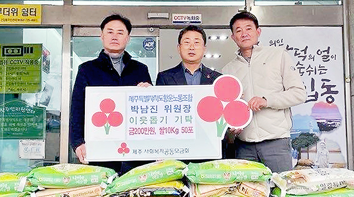 제주특별자치도 항운노동조합 제주시지부(위원장 박남진)는 지난 25일 건입동(동장 현치하)에 지역 내 저소득가구에 지원해 달라며 성금 200만원과 쌀 10㎏ 50포를 기탁했다.