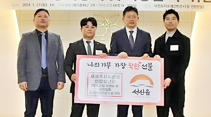 재제주시성산읍연합청년회는 지난 27일 제주시 아젠토피오레컨벤션에서 김한규 국회의원과 현기종·현지홍 제주자치도의원 등이 참석한 가운데 2024년 정기총회 및 부현일 신임 회장 취임식을 개최하고 기부 받은 쌀 660㎏(230만원 상당)을 성산읍에 기탁했다.