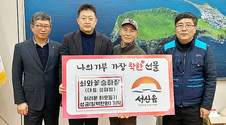쇠와꽃승마장(대표 정해병)은 설 명절을 맞아 지난 6일 서귀포시 성산읍(읍장 김경범)을 방문해 어려운 이웃 돕기 성금 100만 원을 기탁했다.