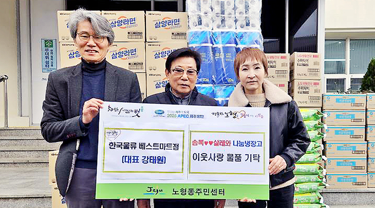 한국물류 베스트마트점(대표 강태원)은 지난 7일 제주시 노형동주민센터(동장 김신엽)을 방문해 세제, 화장지, 라면, 쌀, 즉석국 등 160만원 상당의 후원물품을 기탁하며 이웃사랑을 실천했다.