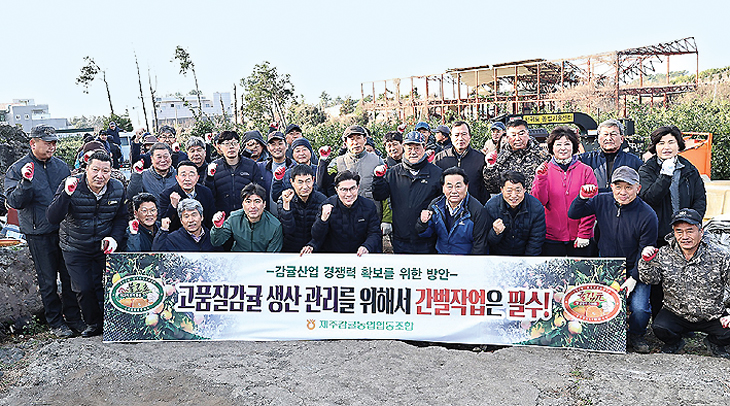 제주감귤농협(조합장 송창구)은 고품질감귤 생산을 위한 감귤원 간벌사업 추진목표 달성 및 실천결의를 다지기 위해 지난 7일 중문지점 원대호 조합원 과원에서 고품질감귤 생산을 위한 감귤원 1/2간벌 발대식을 개최했다.