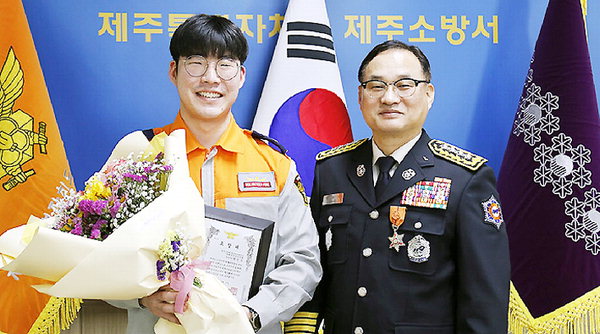 제주소방서(서장 양영석)는 13일 제주소방서 소회의실에서 제주한라대학교 대학생의용소방대 현민수 대원에게 의용소방대 발전 유공자 표창을 수여했다.