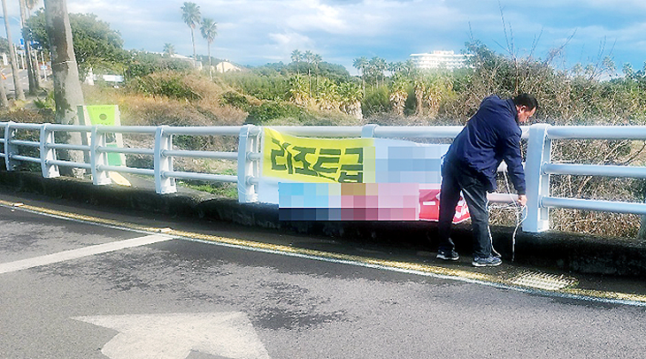 서귀포시 송산동(동장 김종삼)은 지난 13일 쾌적한 도심 환경 조성을 위해 관내 주요 도로변에 부착된 불법 광고물과 현수막 등을 일제 정비했다.