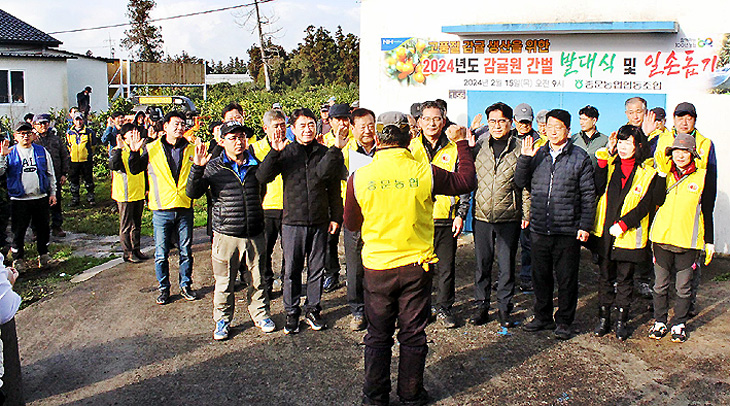 중문농협(조합장 김성범)은 지난 15일 서귀포시 하예동 1009-3번지 조합원 감귤원에서 임정은 제주특별자치도의원, 김창윤 서귀포농업기술센터장, 고권우 서귀포시 감귤농정과장, 윤재춘 제주농협본부장, 중문농협 임직원 및 청년부 등 90여 명이 참여한 가운데 고품질 감귤 생산기반 조성을 위한 1/2간벌 발대식 및 일손돕기를 실시했다.