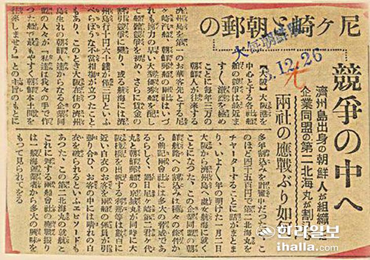 [한라일보] 일본어판 신문인 목포신보 1929년 5월 28일 자 제주 특파원의 기획기사에는 제주와 오사카 간 직항로 운영 현황에 관한 독특한 내용이 소개되었다.