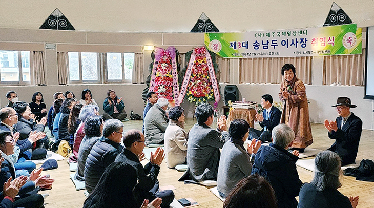(사)제주국제명상센터는 지난 25일 명상센터 수련실에서 열린 정기총회에서 제3대 송남두 이사장 취임식을 가졌다. 취임식에는 제2대 이사장 붓따락끼따 스님과 김일환 제주대학교 총장, 부상일 변호사를 비롯해 이사, 비대위원 등 100여 명이 자리를 함께 했다.