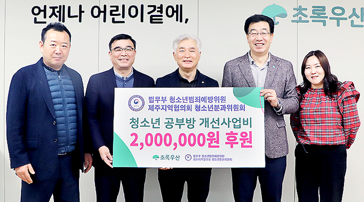 법무부 청소년 범죄예방위원 제주지역협의회 청소년분과위원회(위원장 고성기)는 지난달 29일 초록우산 제주지역본부(본부장 변정근)를 통해 청소년 공부방 개선사업비 200만원을 전달했다.