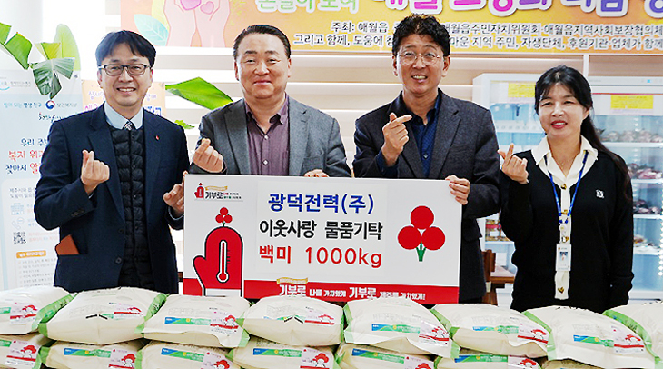 (주)광덕전력(대표 고윤석)은 지난 14일 제주시 애월읍사무소에서 사랑의 쌀 1000㎏를 제주사회복지공동모금회(회장 강지언)에 기탁했다. 이번에 기탁된 물품은 애월읍 관내 저소득 가정에 전달될 예정이다.