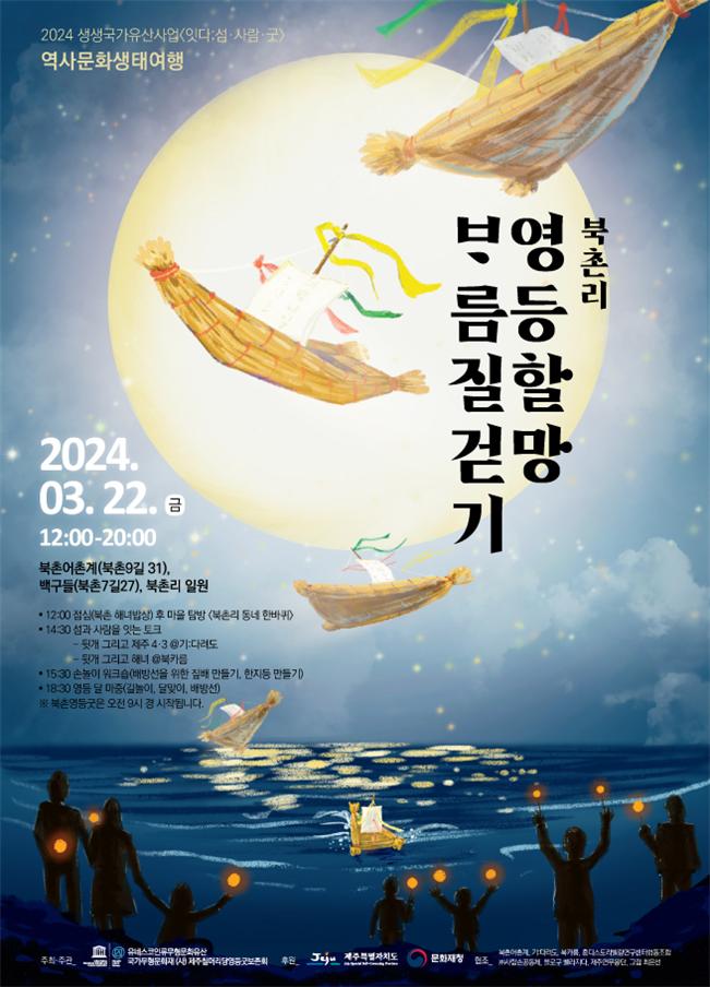 공연은 마을 길을 음악과 춤으로 흥겹게 밟아가는 영등 길놀이, 북촌 해녀들의 물질 공간이었던 고지불턱에서의 영등 달맞이, 짚으로 만든 배에 소원과 소망을 실어 바다에 띄우는 배방선으로 구성됐다. 북촌해녀굿이 끝나는 오후 6시 전후로 진행되는 '영등 달 마중' 공연엔 누구나 참여할 수 있다.
