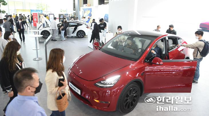 전기자동차 관련 행사장을 찾은 도민들이 전시된 전기차를 삺보고 있다.