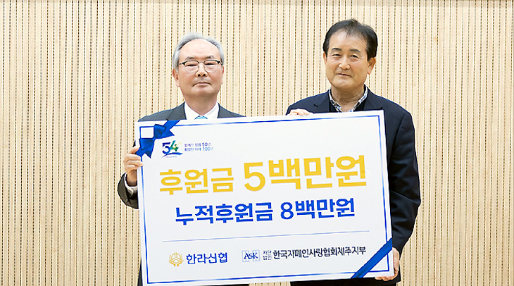 한라신협(이사장 강정신)은 지난 2일 제주혼디누림터에서 진행한 '제17회 세계 자폐인의 날' 기념식에서 (사)한국자폐인사랑협회 제주지부에 500만원의 지원금을 전달했다.