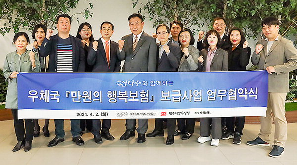 제주개발공사 송형관 기획총괄(상임이사)은 "우체국 만원의 행복보험 보급을 통해 도내 취약계층을 각종 상해와 재해로부터 보호할 수 있는 계기가 되기를 바란다"며 "제주개발공사는 지역 내 기관 간 협력을 통해 복지사각지대 해소를 위해 더욱 노력하겠다"고 밝혔다.