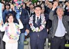 제주자치도의회의원 제주시 아라동을 보궐선거에서 당선이 확정된 양영수 후보가 11일 자신의 선거사무소에서 지지자들의 환호에 화답하고 있다.