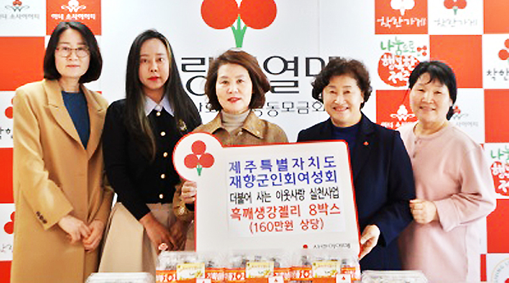 제주특별자치도재향군인회 여성회(회장 강성림)는 지난 9일 제주사회복지공동모금회(회장 강지언)를 방문해 160만원 상당의 흑깨생강젤리를 기탁했다.