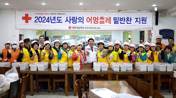 대한적십자사제주특별자치도지사(회장 정태근)는 청솔적십자봉사회(회장 김인행), 남원적십자봉사회(회장 강윤숙) 및 삼다적십자봉사회(회장 강순화) 등 봉사원 50여 명이 참여한 가운데 취약계층 309가구에 사랑의 어멍촐레 밑반찬을 전달했다.