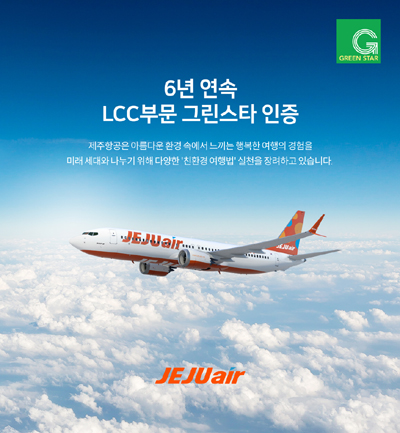 제주항공(대표이사 김이배)이 한국경영인증원이 선정하는 '그린스타(GREEN-STAR)' 인증에 6년 연속 저비용항공 부문 1위로 선정됐다.