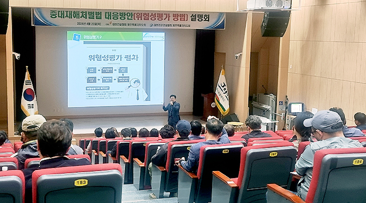 대한건설협회 제주특별자치도회(회장 김기춘)와 대한건설협회 제주특별자치도회(회장 백상훈)는 공동으로 지난 25일 서귀포시청 문화강좌실에서 회원 대표 및 임·직원들을 대상으로 '중대재해처벌법 대응방안 및 위험성 평가방법 설명회'를 개최했다.