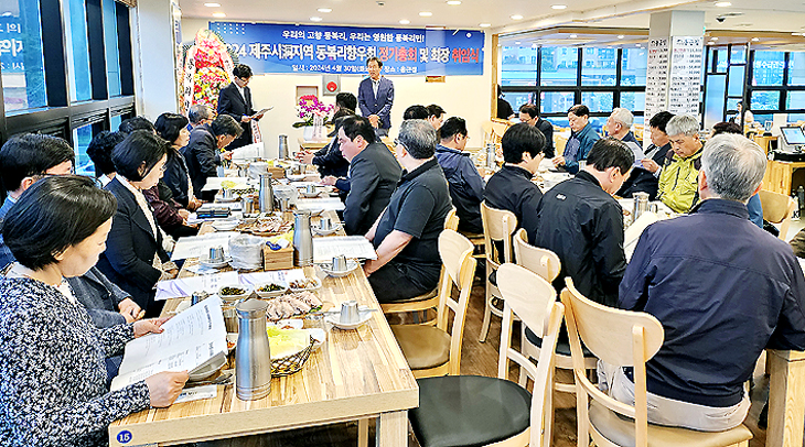 (재)제주시동지역 동복리향우회는 지난달 30일 제주시내 음식점에서 김병수 동복리장 등 고향 자생단체장과 회원 30여 명이 참석한 가운데 2024년 정기총회 및 김태보 제7대 회장 취임식을 개최했다.