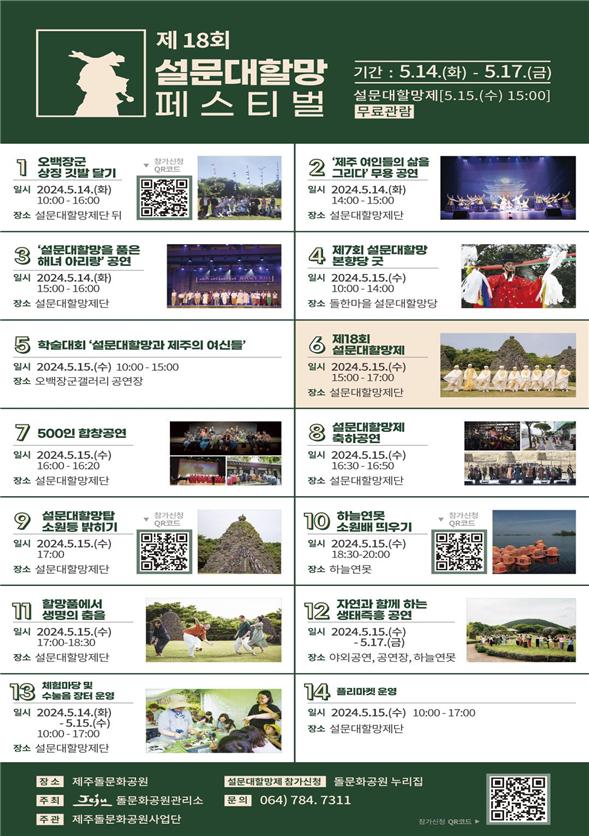 제주특별자치도 돌문화공원관리소는 오는 14~17일 제주돌문화공원 내에서 '오백장군 미래를 밝히다'를 주제로 '제18회 설문대할망 페스티벌'을 개최한다.