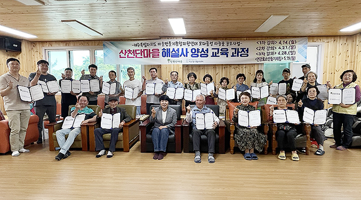 제주시 아라동 산천단마을(마을회장 이동월)의 '산천단마을 해설사 양성 교육과정'이 마을 주민들의 관심과 참여 속에 지난 4월부터 진행돼 지난 19일 총 25명의 수료생을 배출했다.