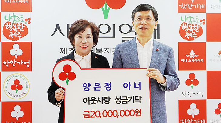 양은정 아너소사이어티 회원은 지난 22일 제주사회복지공동모금회(회장 강지언)를 방문해 이웃사랑 성금 2000만원을 기탁했다.