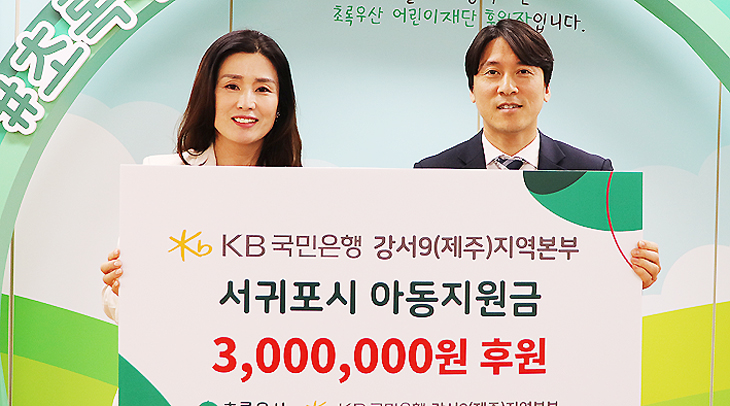 KB국민은행 강서9(제주)지역본부(본부장 송희심)는 지난 20일 서귀포시 관내 아동들을 위해 써달라며 초록우산 제주지역본부(본부장 변정근)에 300만원을 기탁했다.