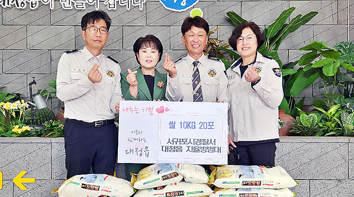 서귀포시 대정읍 자율방범대(대장 유신수)는 지난 20일 대정읍사무소(읍장 정미나)를 방문해 어려운 이웃들을 위한 80만원 상당의 쌀 200㎏을 기탁했다. 기탁된 쌀은 관내 취약계층 20가구에 전달할 예정이다.