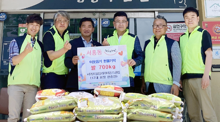서귀포칠십리라이온스클럽(회장 현충민)은 지난 24일 17대 회장 이·취임식에서 기부받은 쌀을 모아 서홍동주민센터(동장 김영철)에 지역 내 어려운 이웃을 위한 쌀 700㎏을 기탁했다.