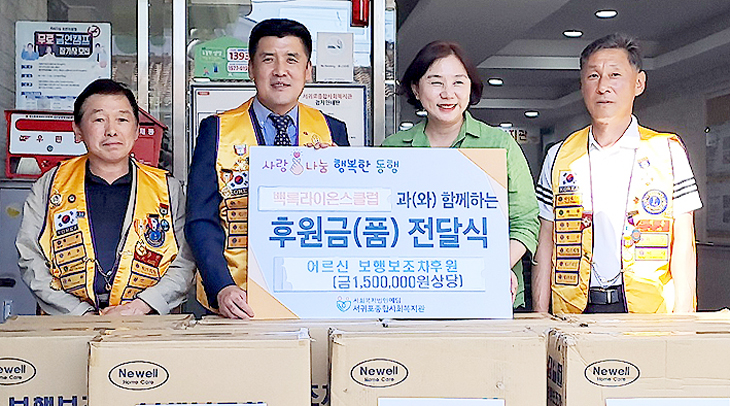 서귀포백록라이온스클럽(회장 현호근)은 지난 24일 서귀포종합사회복지관을 방문해 거동이 불편한 어르신들을 돕기 위해 보행 보조기 11대를 전달했다.