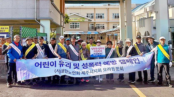 대한노인회 오라동분회(회장 홍신생)는 지난달 29일 노인회원 20여 명이 참석한 가운데 제주시 오라동주민센터~오라초등학교 일대를 순회하며 성폭력·가정폭력 예방을 위한 캠페인을 전개했다.
