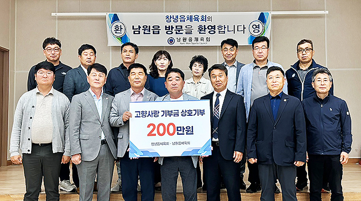 서귀포시 남원읍체육회(회장 양창인)는 지난달 31일 남원읍사무소에서 자매결연 체육회인 경상남도 창녕읍체육회(회장 정철권)와 간담회를 갖고 각각 200만원씩 고향사랑기부제로 상호 기부했다.