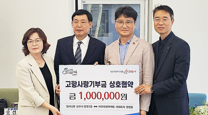 서귀포시 영천동 주민자치위원회(위원장 오창훈)는 지난 8일 자매결연지 교류 행사를 위해 방문한 전남 순천시 왕조2동주민자치회(회장 조평훈)와 고향사랑기부제 상호 기부 협약을 하고 100만원씩 기부하기로 했다.