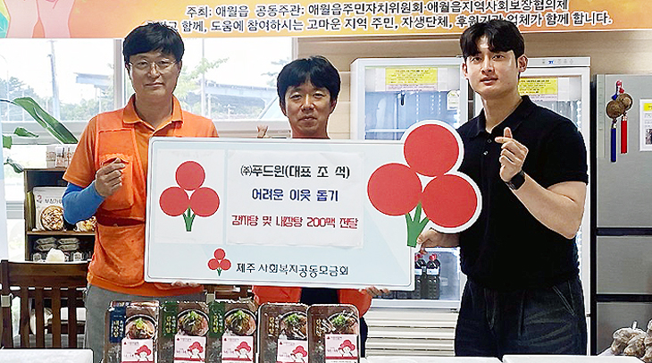 (주)푸드윈(대표 조석)은 최근 애월읍사무소(읍장 김기완)를 방문해 감자탕과 내장탕 200팩을 전달했다.