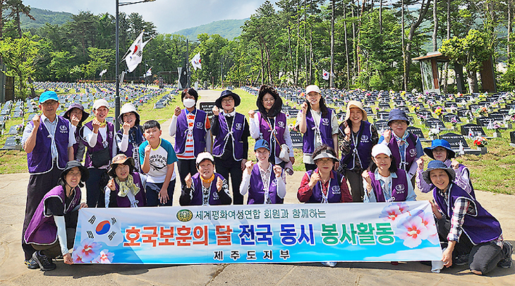 세계평화여성연합 제주지부 및 서귀포지부(회장 라이도바·모니카, 이경순)는 지난 15일 6월 호국보훈의 달을 맞아 국립제주호국원에서 여성연합 회원과 함께 첨전용사 묘비를 닦는 봉사활동을 진행했다.