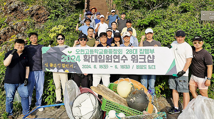오현고 총동창회 발전방안 모색을 위한 '2024 확대임원연수 워크숍'에 앞서 열린 이번 행사에는 제28대 집행부 임원 25명이 참여해 비양도 환경정화를 위해 구슬땀을 흘렸다.