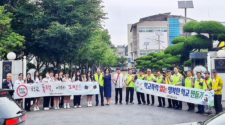 중등 퇴직 교원으로 구성된 제주교육사랑회(회장 고창근) 회원들은 17일 제주중앙여고에서 학교폭력 예방을 위한 캠페인 활동을 벌이고 안전한 등굣길 지도와 함께 학생들에게 응원의 메시지를 전달했다.