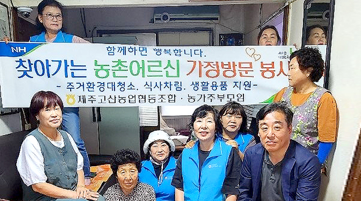 제주고산농협(조합장 고영찬) 농가주부모임(회장 전혜경)은 지난 17일 회원과 임직원 10여 명이 참여한 가운데 용수지역의 80대 어르신 가정을 방문하고 주거 대청소와 생활용품을 전달했다.