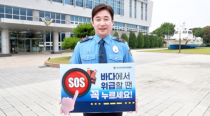 제주해경청 홍보대사 배우 전노민은 18일 제주해경청 청사 앞에서 'SOS 구조버튼 누르기' 릴레이 챌린지에 동참했다.