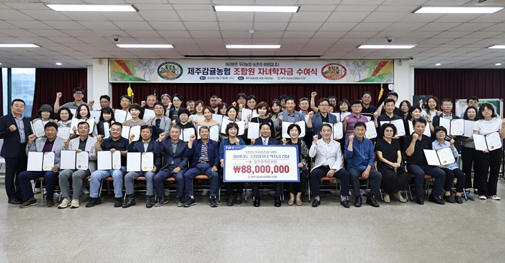 제주감귤농협(조합장 송창구)은 지난달 27일 본점 대회의실에서 조합원과 자녀, 임직원 등이 참석한 가운데 2024년도 조합원 자녀 학자금 수여식을 개최했다.