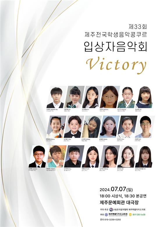 (사)한국음악협회 제주특별자치도지회는 7일(오후 6시 30분) 제주 문예회관 대극장에서 제33회 제주전국학생음악콩쿠르 입상자를 위한 음악회 'Victory'를 개최한다.