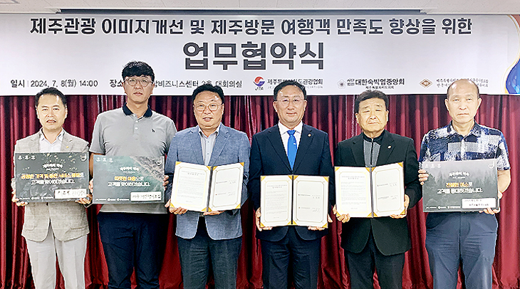 제주특별자치도관광협회(회장 강동훈)는 (사)대한숙박업중앙회 제주도지회(지회장 김창해), 제주특별자치도개인택시운송사업조합(이사장 강승우)과 8일 제주종합비즈니스센터에서 '제주관광 이미지 개선 및 여행객 만족도 향상을 위한 다자간 업무협약'을 체결했다.