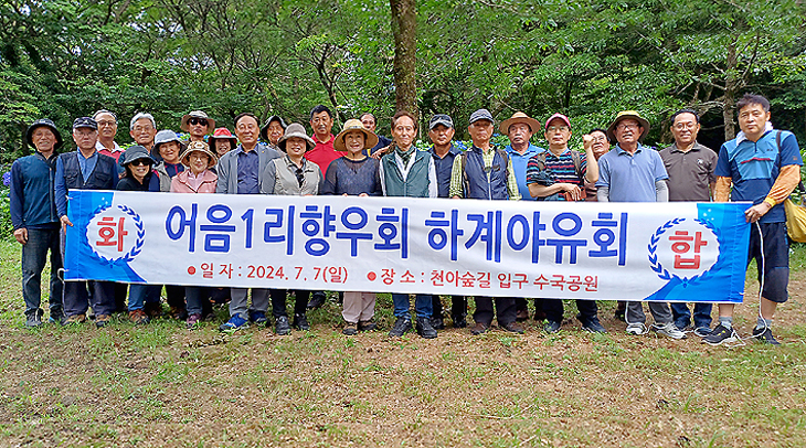 어음1리향우회(회장 김대준)는 지난 7일 제주시 애월읍 소재 천아숲길 입구 수국공원에서 강안민 어음1리장을 비롯해 향우회원과 가족 등 30여 명이 참석한 가운데 향우회원의 친목과 화합을 다지는 2024년도 하계 야유회를 개최했다.