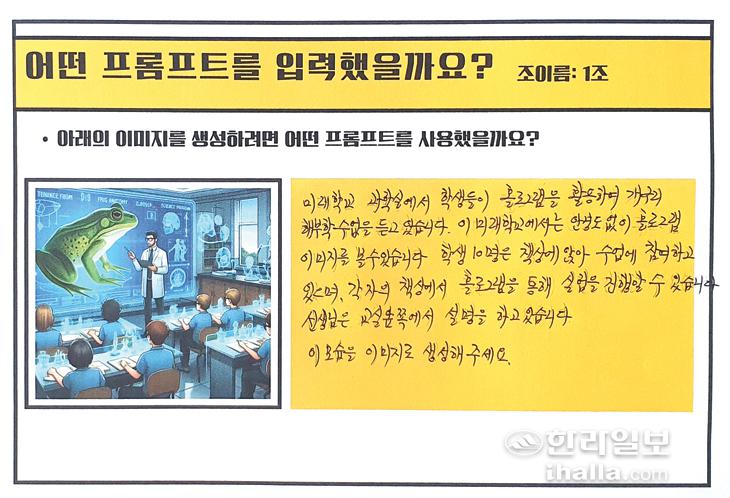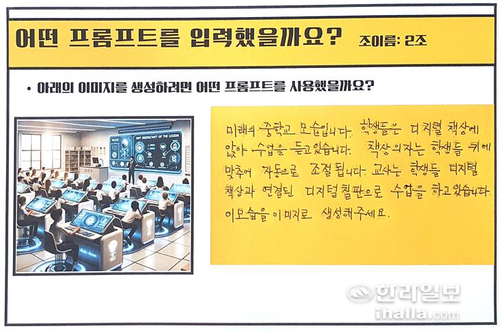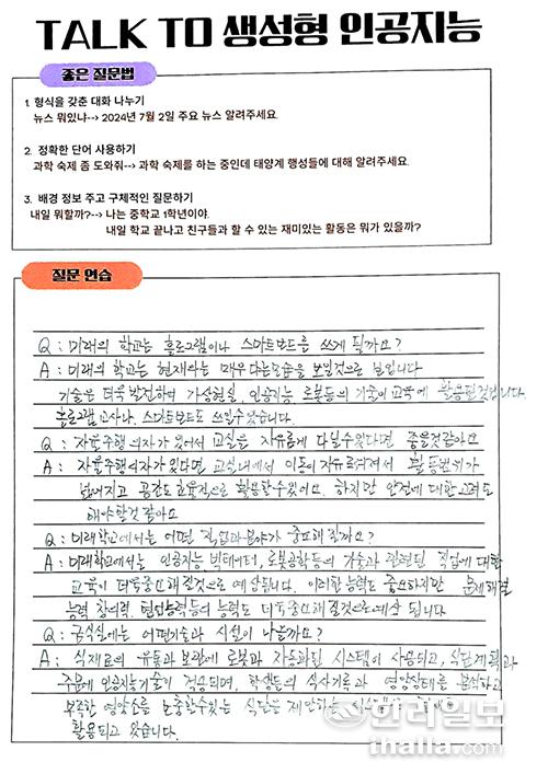 '인공지능 리터러시' 수업은 AI에게 질문하는 방법을 알아보고, 한 가지 주제를 정해 생성형 인공지능에게 명령어로 질문을 해서 자신에게 필요한 이미지 또는 정보를 찾거나 의견을 물어보는 활동으로 진행한다. 질문도 연습이 필요하다.