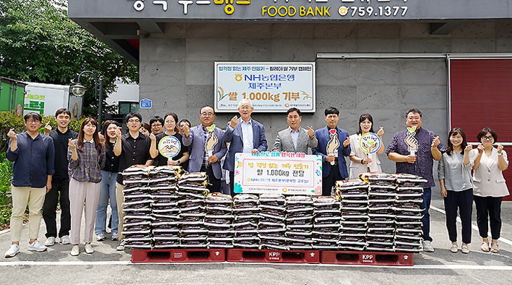 NH농협은행 제주본부(본부장 고우일)는 지난 8일 푸드뱅크를 운영하고 있는 제주도사회복지협의회(회장 고승화)를 찾아 '밥걱정 없는 제주만들기-릴레이 쌀 기부 캠페인'에 동참하기 위해 쌀 1000㎏을 전달했다.
